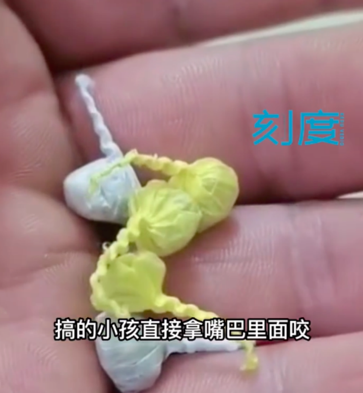 視頻畫面顯示,壹位男子手拿著5個摔炮,旁邊還有小孩的哭聲,他表示:“生產廠家你們出來!做摔炮就做摔炮,別搞得跟糖壹樣,搞得孩子直接拿嘴巴咬。砰壹下哭了,已經哭了1個小時了,還在哭。”