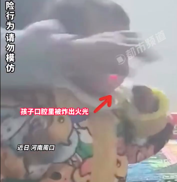 畫面顯示,壹女子先將摔炮扔在了地上,旁邊壹兒童直接拿起摔炮就放進嘴裡,壹旁的媽媽趕忙攔著,但沒制止住,可以看見寶寶的嘴裡都有火花。所幸的是摔炮威力小,孩子沒有受傷。