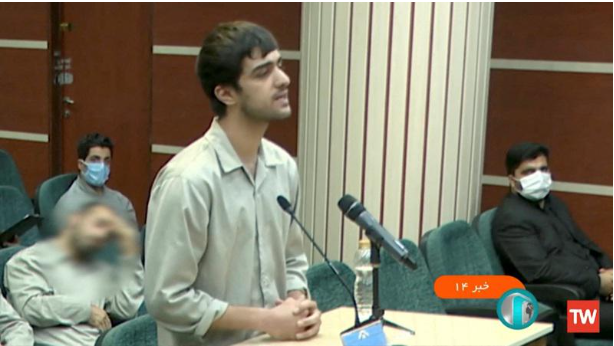 伊朗7日以去年11月杀害一名安全部队成员为由处决两人,图为其中一人侯西尼在受刑前站上法庭。(路透)