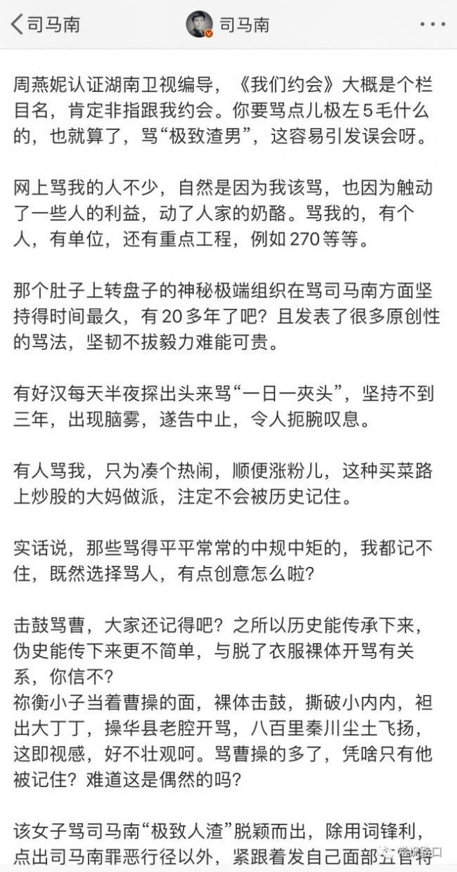 周燕妮是湖南衛視《我們約會吧》欄目的導演,年輕有為,有壹定的影響力。可能是她看不慣司馬南的作風已久,近期終於忍無可忍,所以選擇在公共平台上指名道姓痛罵,猛烈批判司馬南。