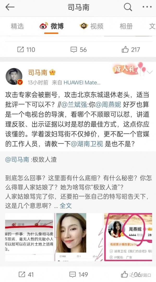 面對周燕妮明目張膽的辱罵,司馬南豈能坐視不管?看得出來,這條微博的殺傷力很大,直接把司馬南激怒了,他半夜就發文回懟,但語氣比較平和,似乎有意克制。