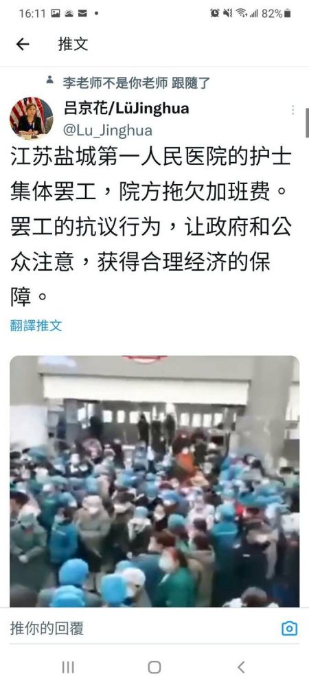 另外,本月 10 日,中國江蘇鹽城第壹人民醫院更是發生護士集體罷工的事件,根據推特網友“呂京花”發布的貼文表示,由於中國疫情大爆發,醫院護士幾乎天天都需要加班,然而院方卻拖欠加班費,因此發生罷工的抗議行為,目的是希望讓政府和公眾注意,獲得合理經濟的保障。對此,底下網友也留言表示,“醫護加油,拿不到錢絕不退讓,只有不退讓,共黨才會怕,才能拿到錢。”、“醫護加油!這是權利的覺醒,真心支持。”更有人表示,“如果共產黨在這樣下去,這樣的抗議會越來越多的,這只是剛剛開始。”- 新聞來源於其它媒體,內容不代表本站立場!