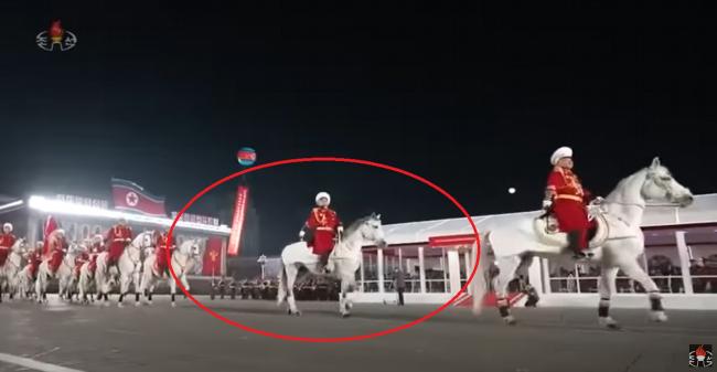 據韓媒News1指,圖內紅圈中的白馬為金正恩女兒金朱愛擁有的白馬,2月8日現身在朝鮮人民軍建軍75周年閱兵儀式(影片截圖)