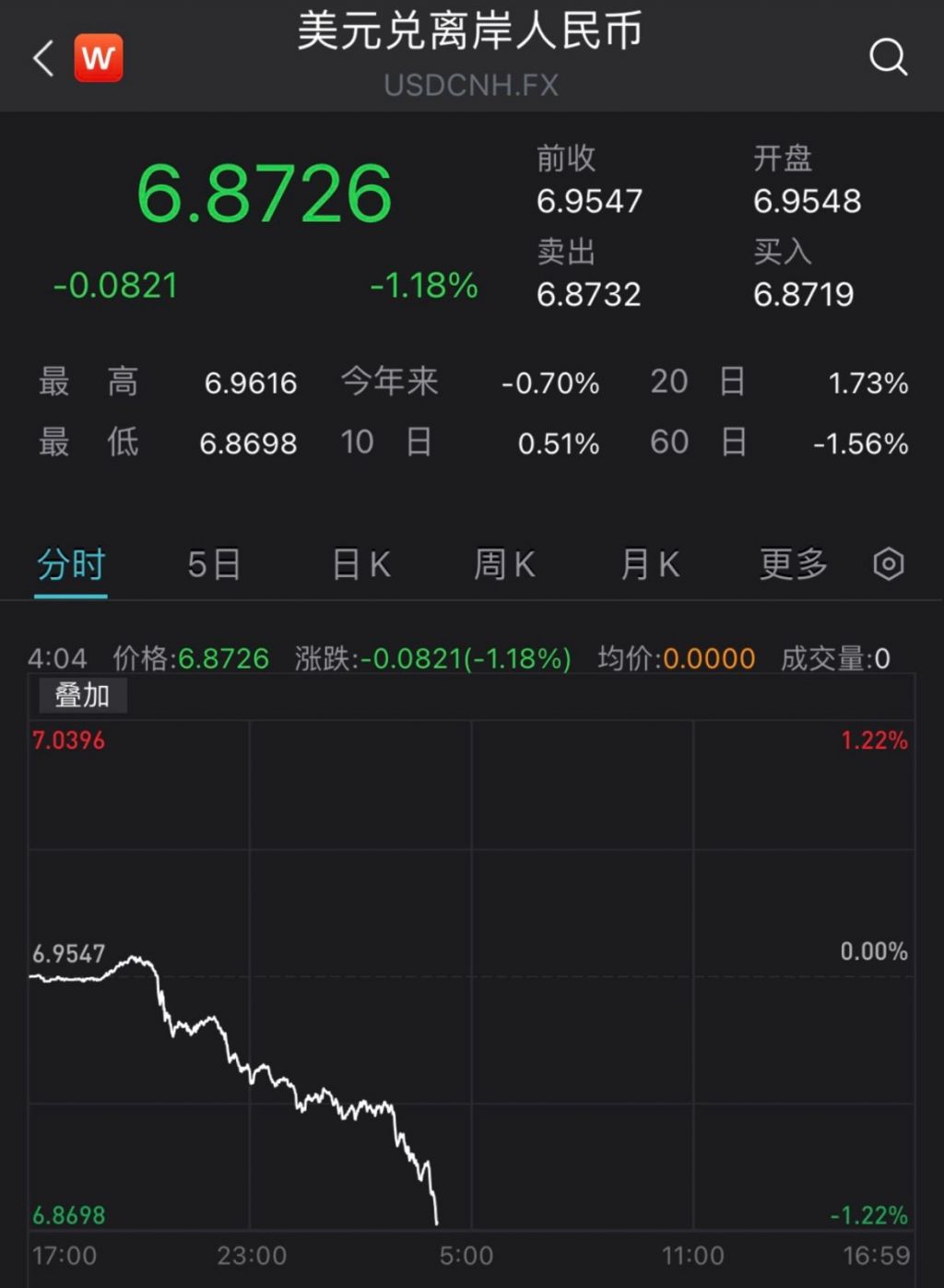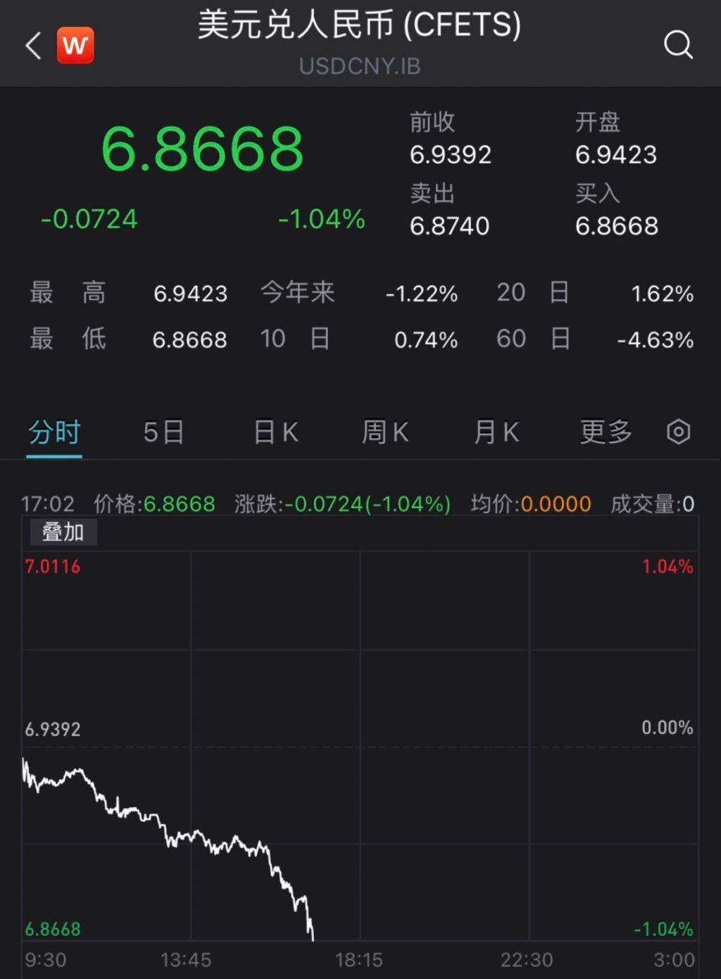 3月1日,人民幣對美元即期匯率北京時間16時30分收盤報6.8854,較上壹交易日漲538個基點,在進入夜盤交易時間後進壹步走高,進壹步升破6.88和6.87關口,漲超700點。
