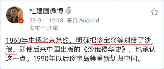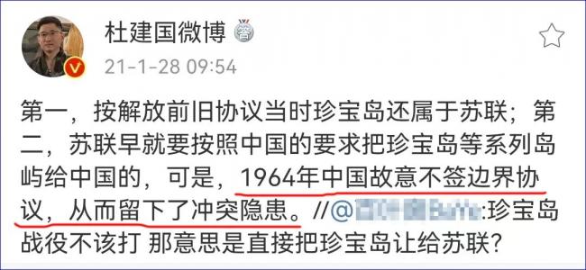 早在2021年1月28日, @杜建國微博 在談到珍寶島自衛反擊戰時,就公開聲稱: