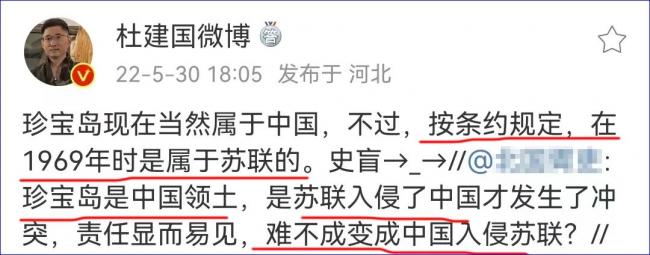 在2022年5月30日,有網友指出“珍寶島是中國領土,是蘇聯入侵了中國才發生了沖突”時, @杜建國微博 惱羞成怒,罵網友是“史盲”,仍然堅持認為: