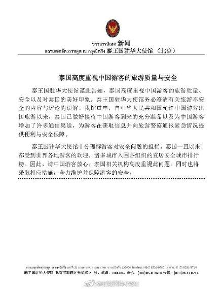 近日,泰国旅游 安全性话题登上微博热搜,很多网友对去泰国旅游的安全性表示担忧。泰国驻华大使馆23日发文表示,泰国高度重视中国游客的旅游质量与安全。泰国驻华大使馆称,自中华人民共和国允许中国游客出国旅游以来,泰国已做好接待中国游客到来的充分准备以及为中国游客增加了许多通信渠道,为游客在获取信息并向旅游警察通报紧急情况提供便利与安全保障。