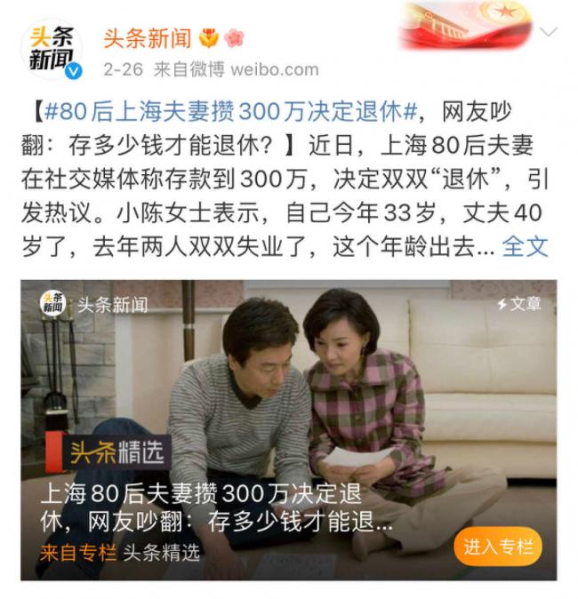 要麼家裡有礦,要麼有車有房,要麼至少也有壹線城市戶口和不俗存款,比如之前引發熱議的存夠300萬決定“提前退休”的80後上海夫妻。