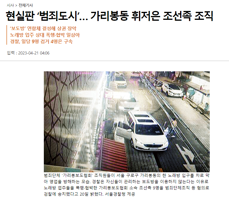 本月20日,首爾警察廳毒品犯罪調查隊表示,以組織犯罪團體、妨礙業務、監禁、強迫、恐嚇等嫌疑將名為“加裡峰皮條協會”的犯罪團體成員等九人移送檢察機關。
