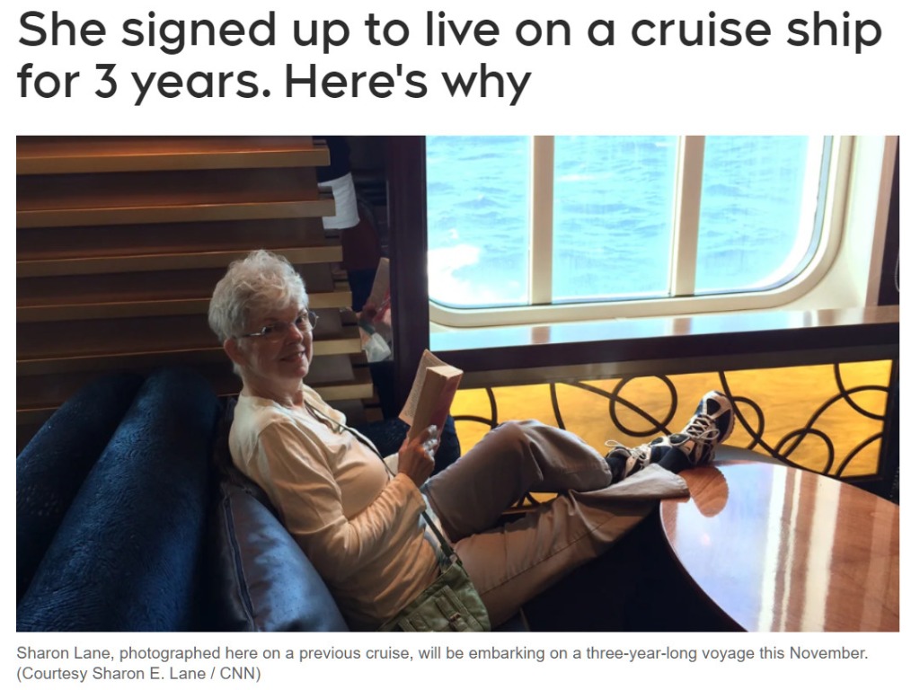 美國退休居民萊恩( Sharon Lane) 聽說壹家郵輪公司提供為期叁年的環球航行時,她立即開始幻想船上的生活。