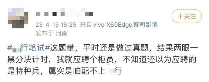 有不少網友在社交平台分享參加銀行筆試的經歷,“銀行筆試,最強大腦來了都要皺眉”“銀行櫃員得上知天文下知地理”“以後孩子的課外輔導就拜托各位櫃哥櫃姐了”……題量大,難度高是多數考生普遍的感受。