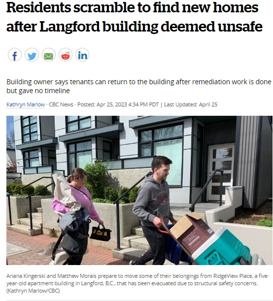 最近,溫哥華島Langford市政府在檢測中發現這棟出租公寓樓結構又有不安全問題後,建議出租樓再次疏散住戶。周壹下午,市政府緊急舉行新聞發布會上,宣布這棟出租公寓樓所有居民立即搬離該建築 。