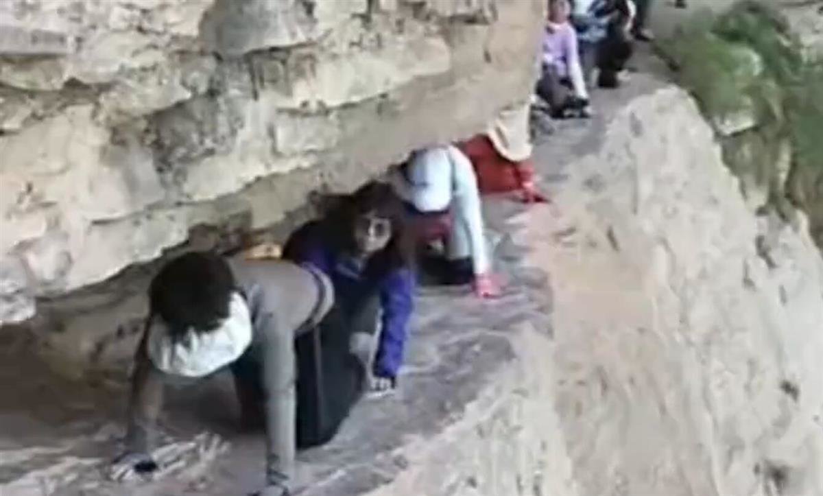 現場視頻顯示,眾多游客在壹處低矮的“石頭縫”裡跪地爬行,眾人身側就是懸崖,且眾人身上沒有任何保護防護措施。視頻中還有人聲稱,“盡量往裡靠,這壹段路特別危險,爬過去就沒事了。”