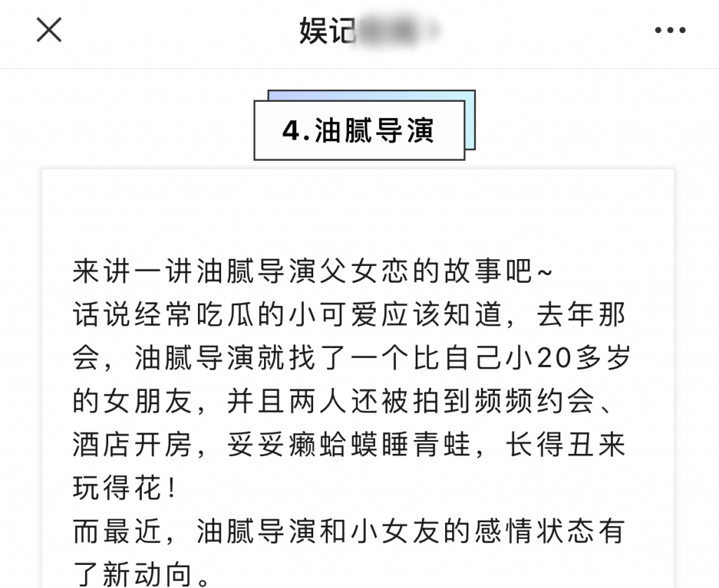 最近有某導演在自己的社交網站上爆料某油膩男導演的戀情故事,其中就寫到是去年被拍攝到新戀情的,並且兩個人相差20多歲。壹時間也是令人想到陳思誠和阮巨,雖然這名爆料號的導演沒有指名道姓,但是處處細節都針對陳思誠和阮巨,可謂是居心叵測。