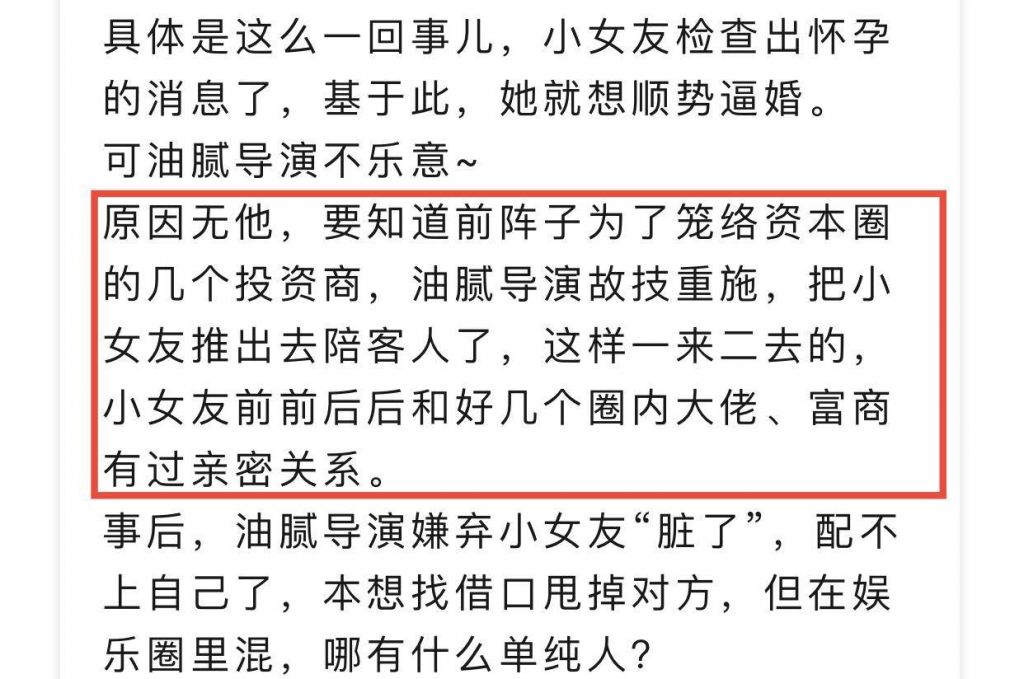 這名導演指出油膩男導演還將自己的小女友送到資本圈大佬那裡陪酒之類的,這壹些行為儼然讓阮巨成為自己拉攏資本的工具,壹度引起外界的嘩然。其中很多描述之詞拾分的惡劣,指向性也很強,看來這名爆料者對陳思誠也是頗有不滿。