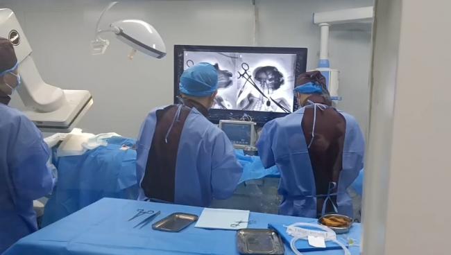 馬永傑:去年,團隊曾在羊身上完成了首例介入式腦機接口動物試驗。腦電極植入術由介入機器人輔助完成,我在主端操作完成了部分血管造影。試驗最終在羊腦血管內完成了傳感器植入,並成功采集到了腦電信號。