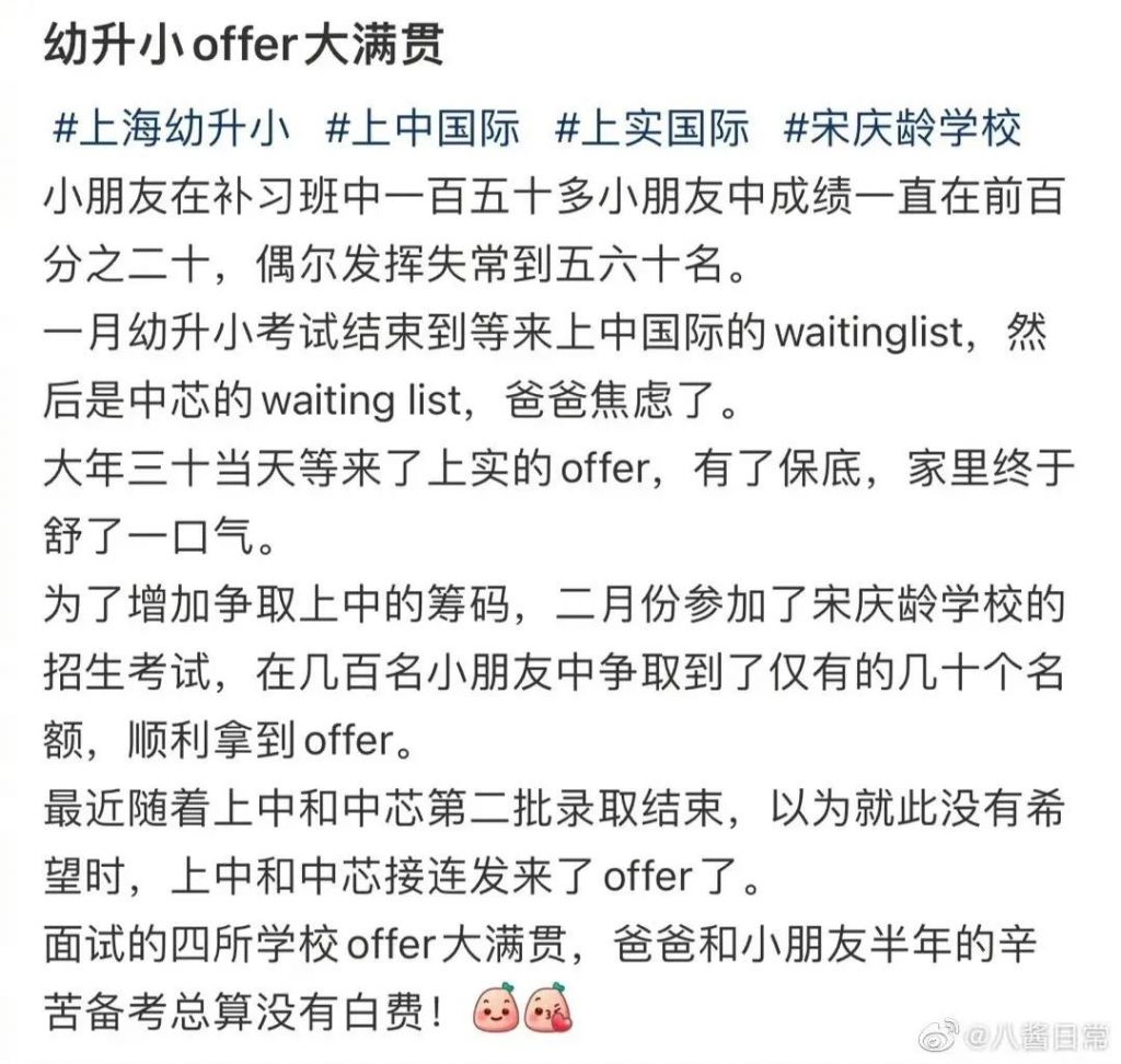 這小孩壹口氣拿肆個幼升小offer,才伍六歲的孩子,怕是已經超越了不少人壹輩子能拿到的offer總數了吧。