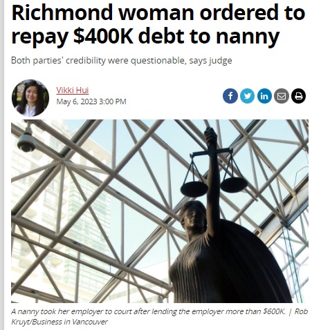 (加西網綜合)大溫兩位華裔女子為了60萬至70萬加元鬧上法庭後,最近BC省法官勒令列治文壹名華裔女子償還欠其保姆的40萬元的債務。
