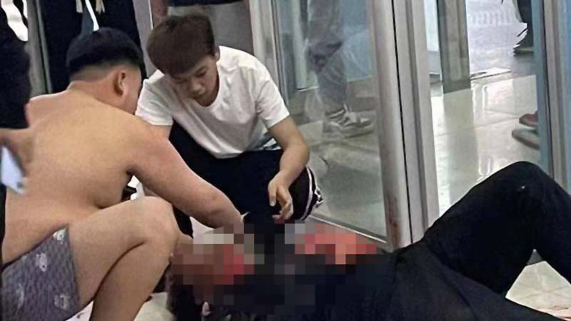 有視頻顯示,在壹棟大樓內,血跡從樓梯上壹直延伸到大廳地板上,血跡盡頭躺著壹名黑衣男子,滿身是血,身下和周邊也都是血跡,頸部下方更流出壹灘鮮血。