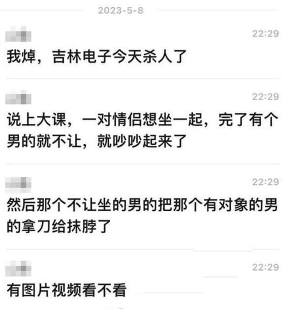 5月8日,網傳影像顯示,吉林電子信息職業技術學院發生割喉案,地上滿是鮮血,據稱起因只是壹個座位。