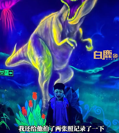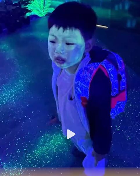 視頻顯示,在伍彩斑斕的體驗館內,壹名小孩的臉上也發出熒光,與身後背景完美融合。