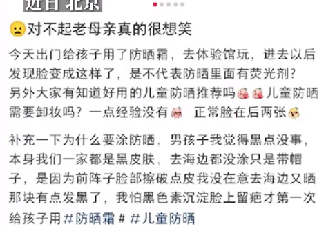 5月12日,根據白鹿視頻報道,近日,北京壹網友曬出自己4歲兒子在塗了防曬霜之後,於暗處臉上發綠光,此事引發關注。