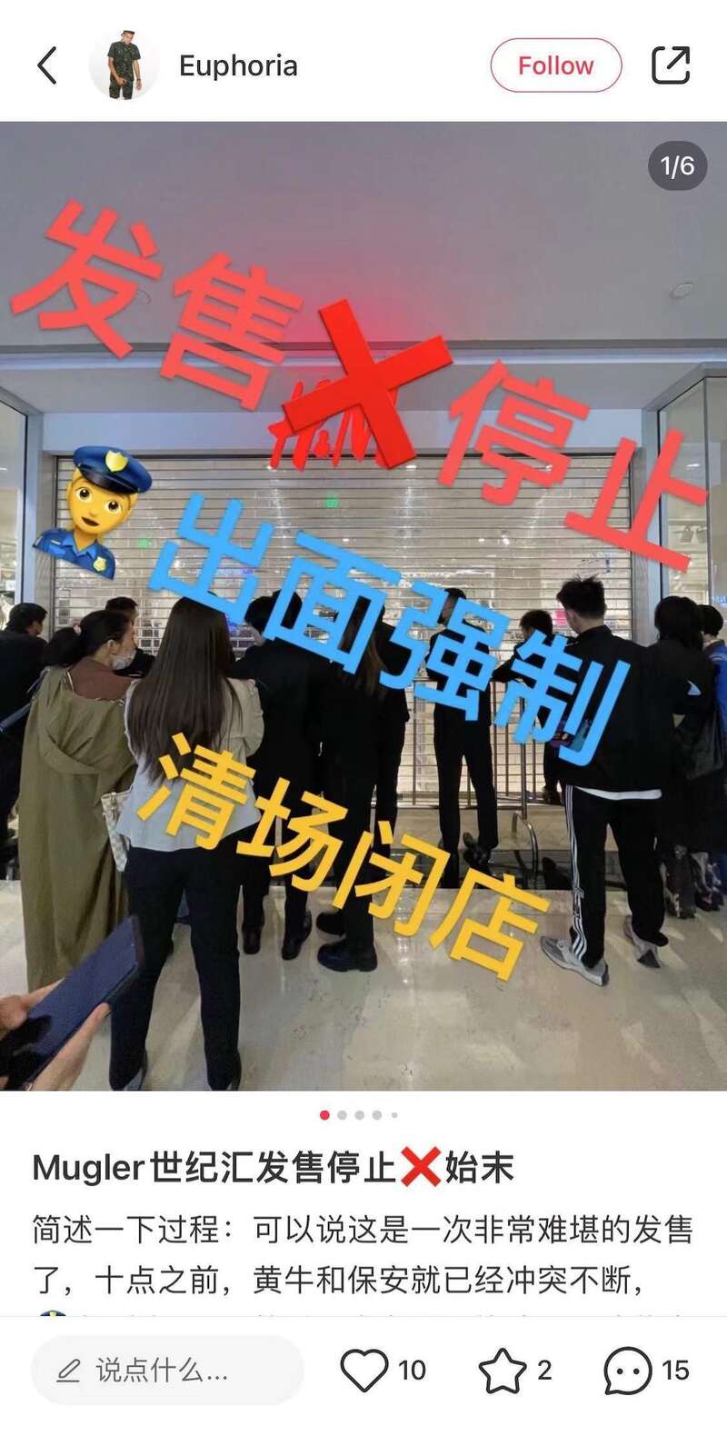在上海世紀匯,消費者壹度和囤貨的黃牛產生沖突,最終導致門店暫時關閉。H&M中國公關團隊向界面時尚表示,已對在發售現場擾亂購買秩序的人員進行勸離,但為了確保顧客的安全,與有關部門溝通後,最終決定取消世紀匯門店的發售活動。