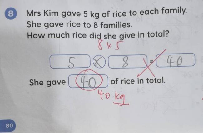 壹名網友在美國知名網絡“Reddit” 論壇發文,他在文中分享姪子写的覊睦数学甜G空掌患餑啃粗敖眉扛黽彝5公斤白米,總共給了8戶家庭,請問她總共給了多少白米?”,而姪子哉N賜晏餑亢螅閽詰紫驢嶄翊π瓷稀5X8=40”,結果竟然被老師用紅筆批改為“錯誤”,甚至還在算法上方寫上“8乘5”以及在答案下方寫上“40公斤”。