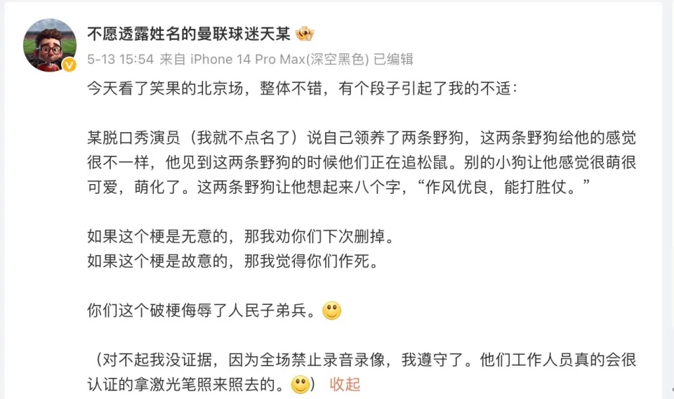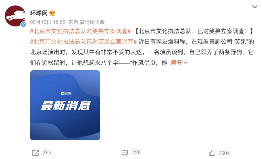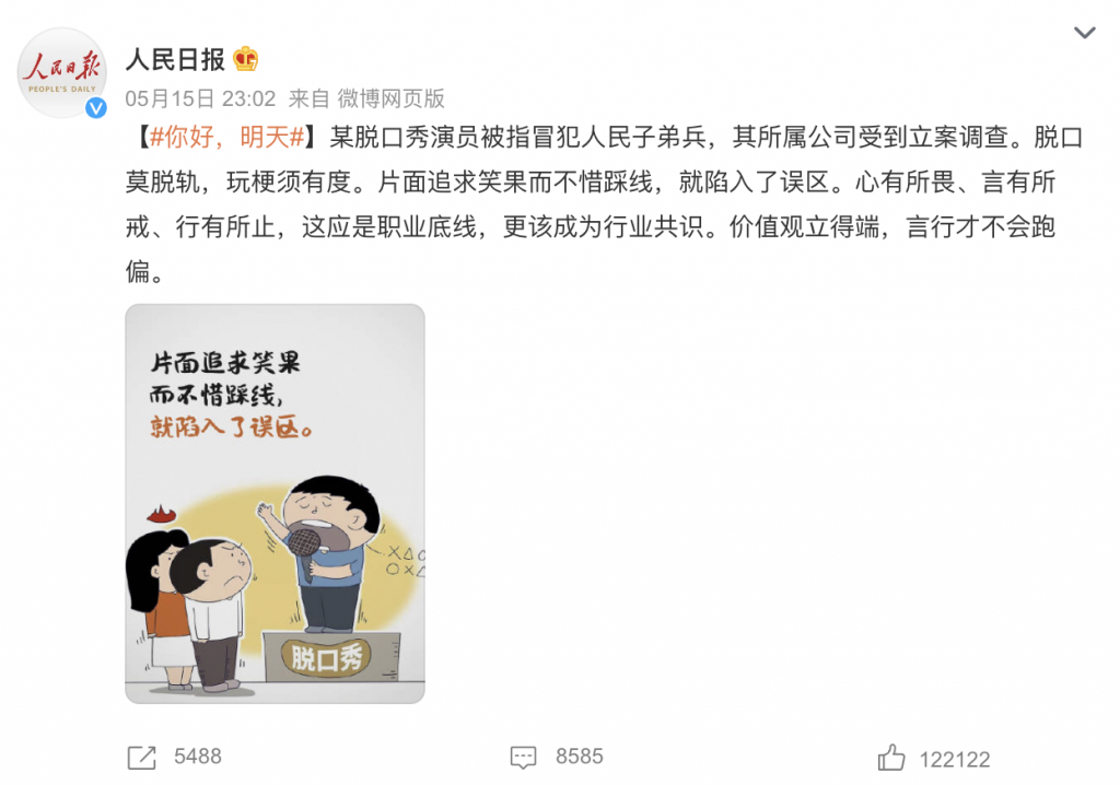 5月13日,脫口秀演員HOUSE(李昊石)在笑果文化脫口秀北京場演出時因形容自己收養的野狗“作風優良,能打勝仗”而引發了個別觀眾的質疑。事後有人在微博公開檢舉,有人則提供了現場錄音,認為這個梗“侮辱了人民子弟兵”,並逐漸形成輿論聲浪。(5月15日,“笑果”話題沖上微博熱搜)