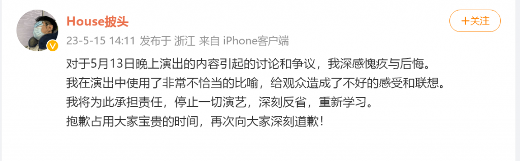 5月15日,演員HOUSE發布微博道歉,對於演出中“使用了非常不恰當的比喻”表示“愧疚和後悔”,並宣布“停止壹切演藝,深刻反省,重新學習”。