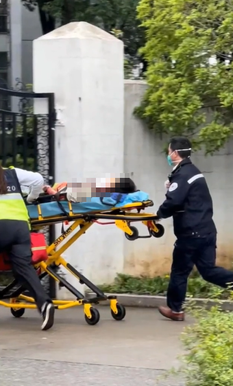 從該網友發布的視頻裡,壹棟建築物前坪有大塊血跡,現場有警方工作人員。壹名年輕男子躺在救護擔架車上,有醫護人員在處置傷口。