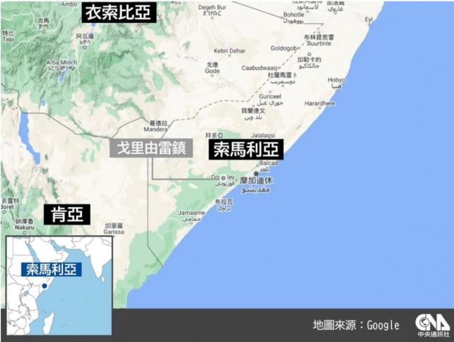 索馬利亞媒體報導,下謝貝利州戈裡由雷鎮附近地區9日發生迫擊砲砲彈爆炸事件,造成大約27人喪命。(中央社製圖)