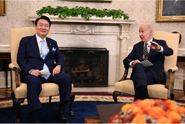 圖為2023年4月26日,美國華盛頓特區,美國總統拜登(右)在白宮橢圓形辦公室與韓國總統尹錫悅(左)舉行會談。(Jim Watson/AFP)