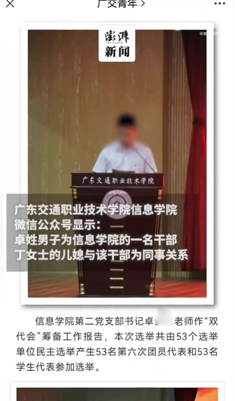 廣東交通職業技術學院信息學院微信公眾號顯示:卓姓男子為信息學院的壹名幹部,丁女士的兒媳與他是同事關系。