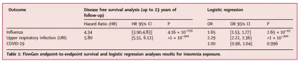 該項研究使用UK Biobank(約231,000名)和Finn Gen(約392,000名)的失眠、流感和上呼吸道感染的初級保健和醫院記錄數據。計算邏輯回歸來評估睡眠質量差與感染、無病生存風險比之間的關系,並進行孟德爾隨機化分析來評估因果關系。