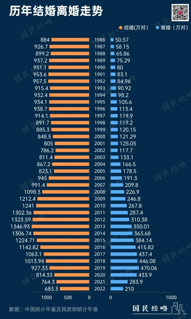 根據民政部數據,2022年我國離婚登記人數為210萬對,與2020年的433萬對相比,可謂大幅腰斬。