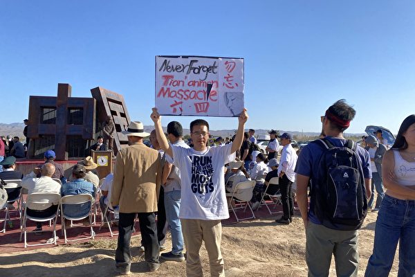 2023年6月4日,甘肅農民何愚在加州自由雕塑公園舉牌抗議中共。