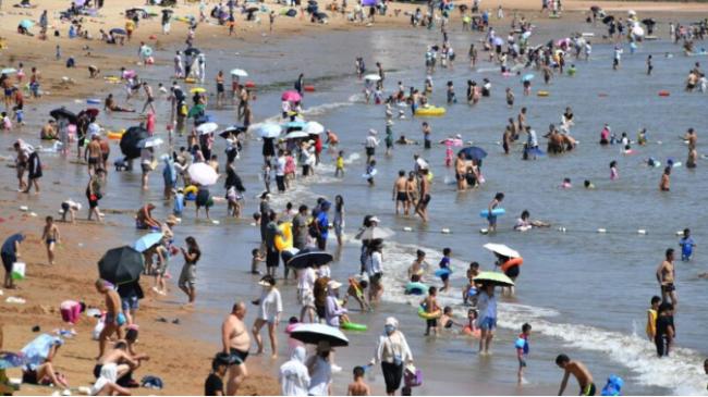 2022年8月1日,中國山東省青島市海灘上的游客 。