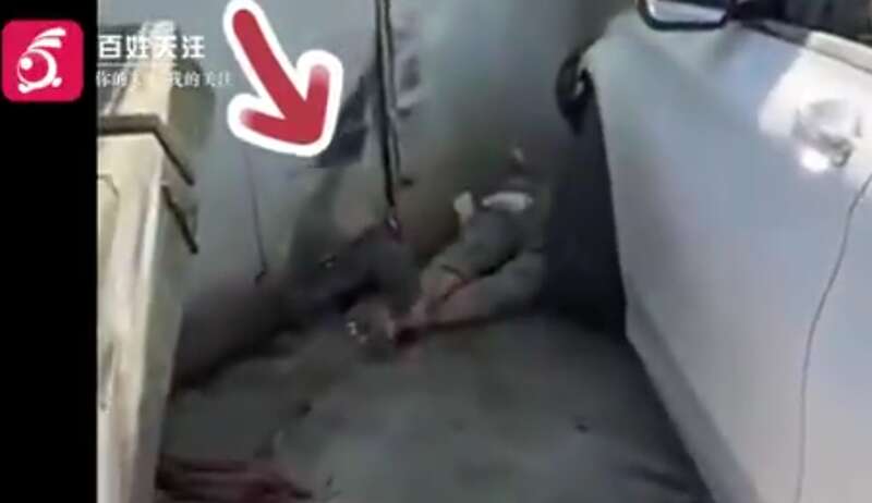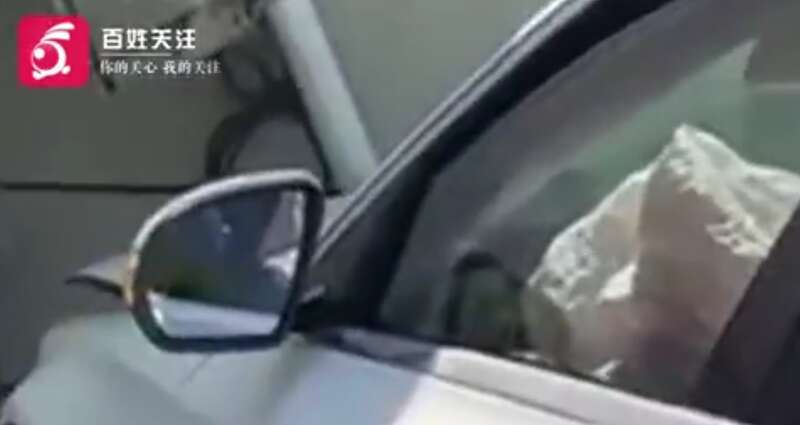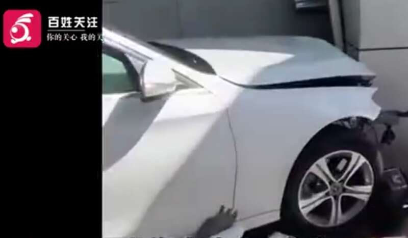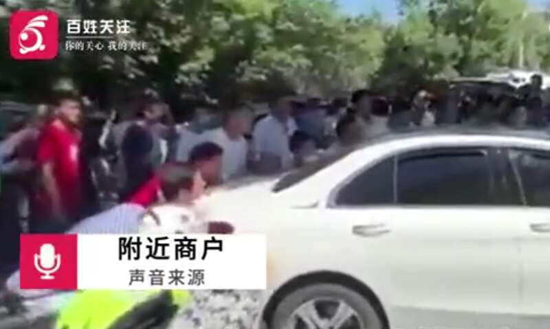 視頻顯示,在牆角處,該男子被擠壓在奔馳車車輪下,車內安全氣囊處於彈出狀態,肇事司機已離開駕駛室。