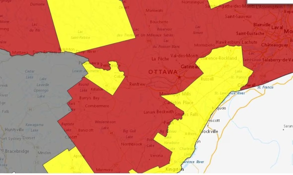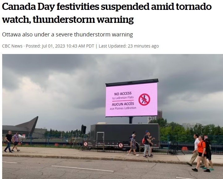 根據環境部的預警信息,安省東部和魁省西部天氣警報地圖,2023 年 7 月 1 日,包括首都渥太華地區大部分地區都處於雷暴和/或龍卷風警告之下。此前計劃的飛行表演也被迫取消。此外包括衛兵換崗、空軍管樂演出都等受到影響。