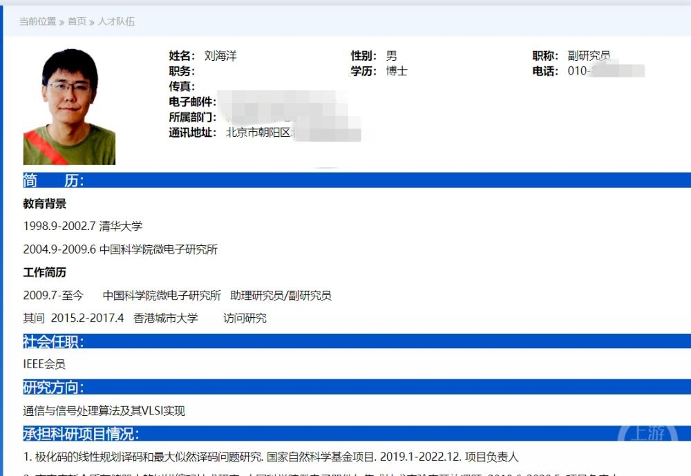 7月5日,上游(电视剧)新聞記者對此事進行了追蹤。在中科院微電所官網,能夠查詢到劉海洋的相關信息,他的學歷為博士,所在部門是新能源汽車電子研發中心,目前身份是中國科學院微電子研究所(以下簡稱:中科院微電所)的副研究員。