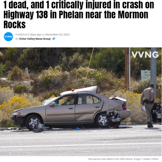 去年11月25日上午11點06分左右,加州費倫(Phelan)的Canyon路附近的138號高速公路上兩車相撞,造成壹起嚴重交通事故。