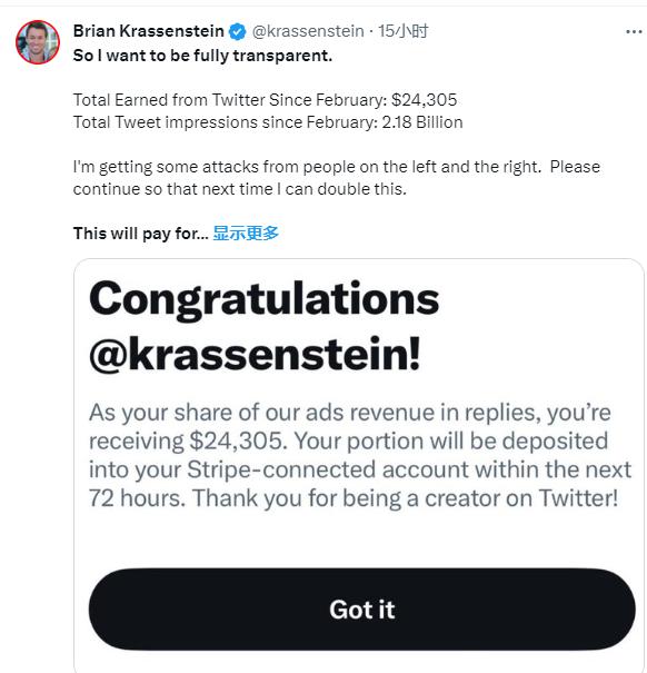舉例而言,擁有 75 萬粉絲的推特自媒體博主 Brian Krassenstein 截圖稱自己收到接近 2.4 萬美元的分成。他同時透露,從今年 2 月開始他的推文總共被瀏覽了 21.8 億次。