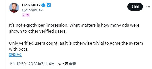 憑借社區裡的分享截圖,有自媒體總結稱 "10 億瀏覽量約等於 1 萬美元" 的結論。馬斯克特地把這條推文拎出來強調稱,這筆錢並不依據整體瀏覽量的數據,最重要的是向多少經過認證的用戶展示廣告。而且只有經過驗證的用戶才算數,這樣能夠避免 " 機器人玩弄系統 "。