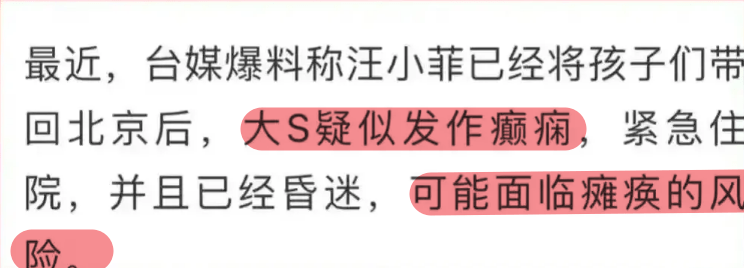 近日,台媒爆料出壹則大瓜,表示大S目前癲癇發作,整個人都無法動彈已經入院治療,但是目前大S凶多吉少,恐怕將癱瘓在床。壹時間也是引起不少人的圍觀和熱議,粉絲們也是表示真假難辨。