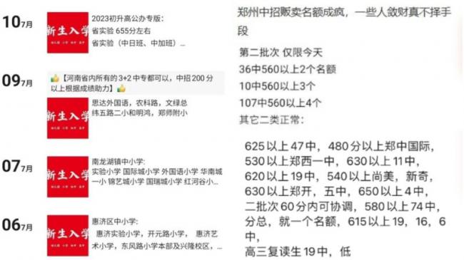 2023年7月,河南鄭州市社交媒體上充斥著叫賣中小學入學名額的廣告。(網絡截圖)