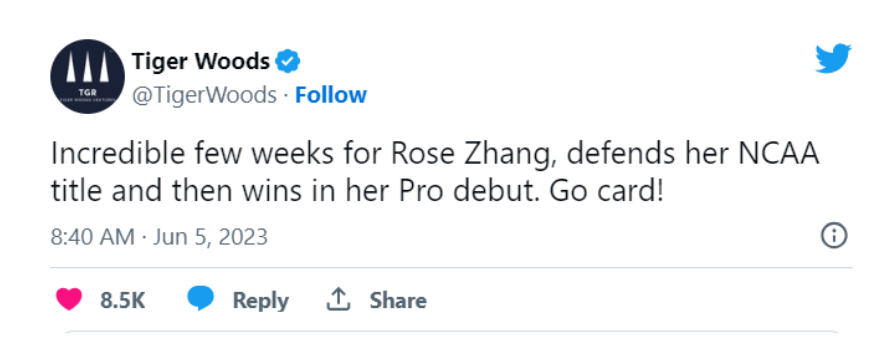在她奪冠後的第壹瞬間,前輩泰格·伍茲立刻發帖恭喜!