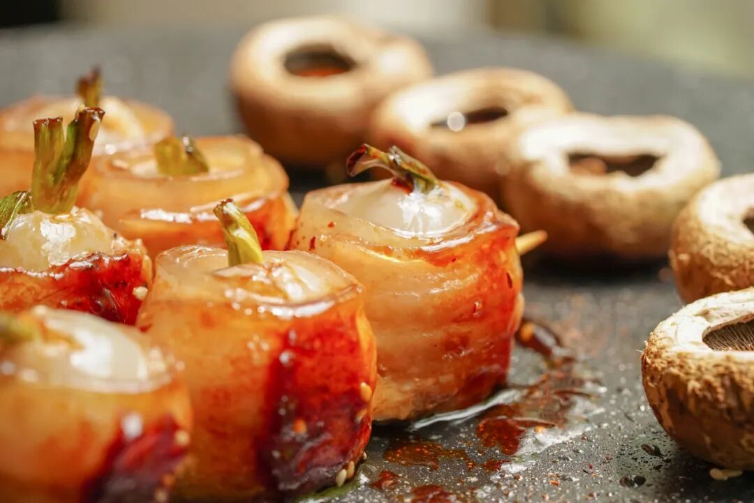 做法非常简单,组合一下腌过的肉和荔枝,一起烤得香喷喷,刷个照烧酱就能端出去惊艳四座了。