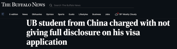 據《Buffalo news》報道,8月6日,美國檢察官特裡尼·E·羅斯 (Trini E. Ross) 宣布:壹名就讀於State University of New York at Buffalo的中國留學生(專題)張同學,目前被控簽證欺詐罪(visa fraud),或將面臨最高10年監禁。