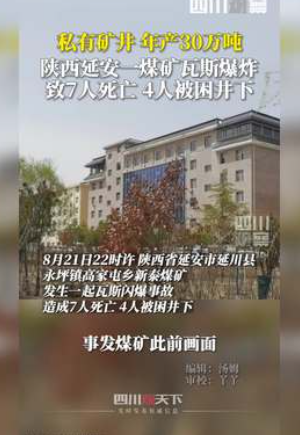 據央視新聞消息,8月21日22時許,陝西省延安市延川縣永坪鎮高家屯鄉新泰煤礦發生壹起瓦斯閃爆事故,造成7人死亡,4人被困井下。